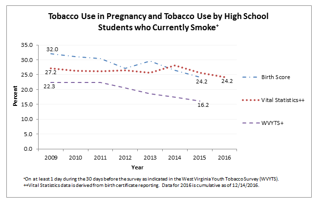 The decreases in smoking rates during pregnancy are similar to decreases in youth smoking rates. Data from the 2015 Youth Tobacco Survey indicate the percentage of West Virginia high school students that smoke has decreased to 16.2 percent from 38.5 percent in 2000.